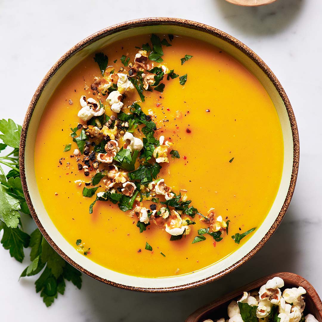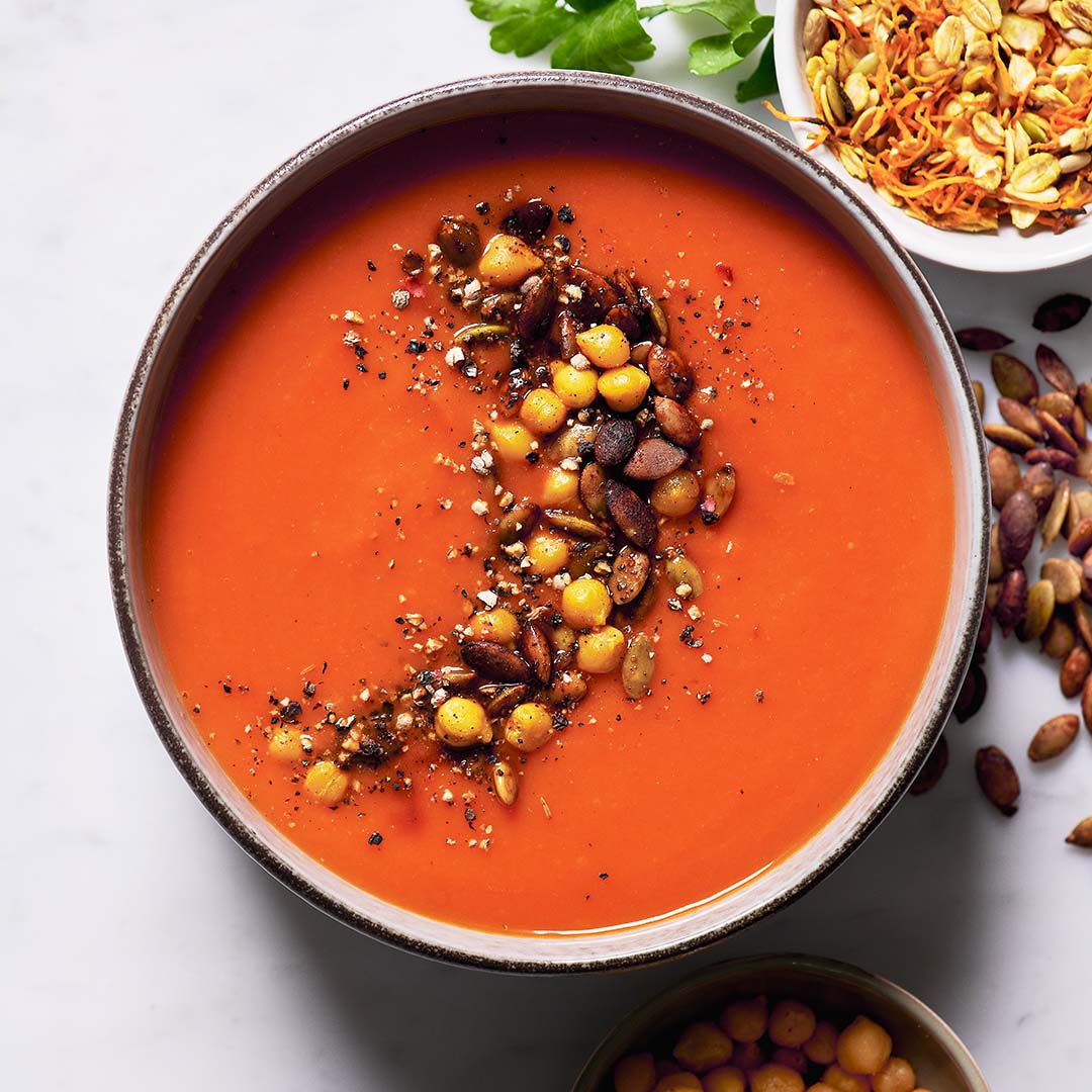 Personalise your soup with our new toppings full of vegetable proteins. Curious? What about popcorn with garlic and parsley, carrot & ginger granola, chickpeas with curry, squash seeds with sesame or red beans with spicy almonds? Your favourite restaurant will rotate the toppings so you can always put a different touch of spunk to (y)our creamy soup!